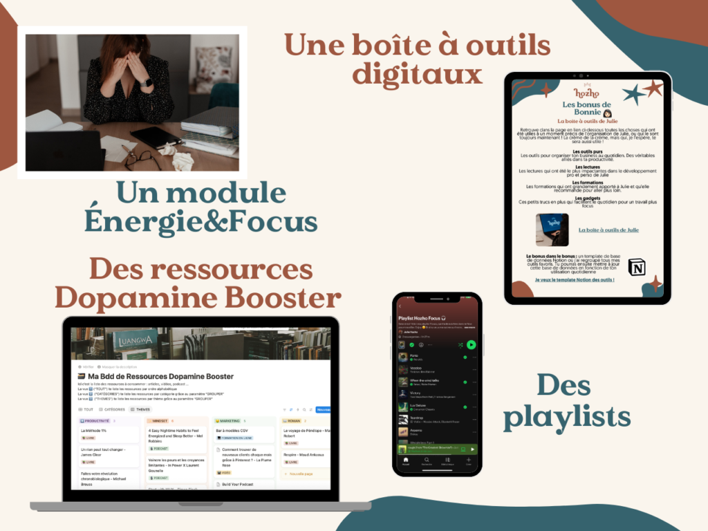 - Des templates et 1 boîte à outil digitaux pour t’aider à gagner encore plus de temps (valeur 247€)